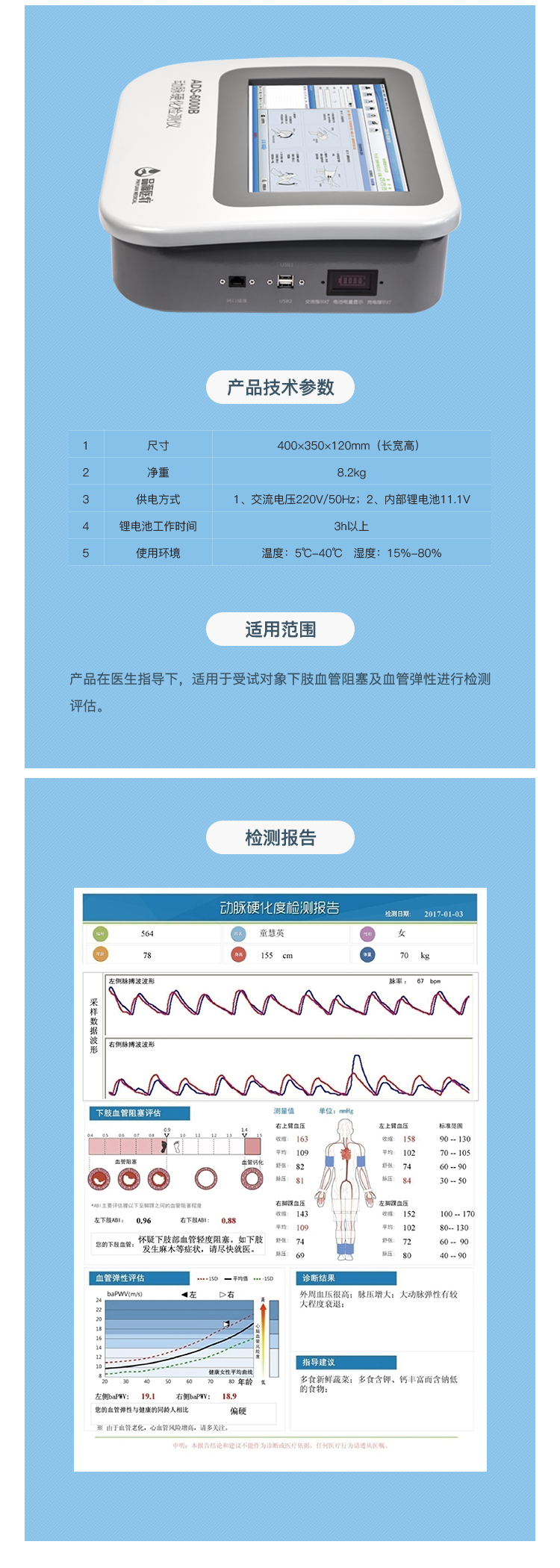 動脈硬化檢測儀在臨床上被廣泛應用于動脈硬化的篩查和診斷。它可以用于評估患者的動脈硬化程度和風險,以制定更有效的治療方案。同時,它也可以用于觀察患者的病情進展情況,以及判斷治療效果。