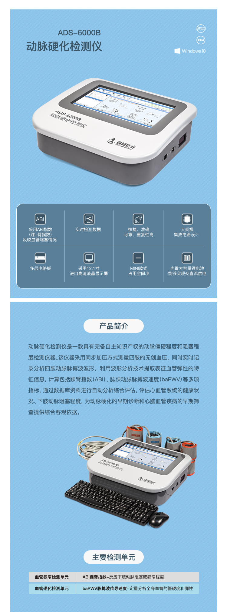 動脈硬化檢測儀是一種用于檢測動脈硬化程度的醫療設備。它可以通過測量動脈的輪廓來評估動脈的硬化程度,從而幫助醫生和患者更好地了解動脈的健康狀況,以及制定更有效的治療方案。